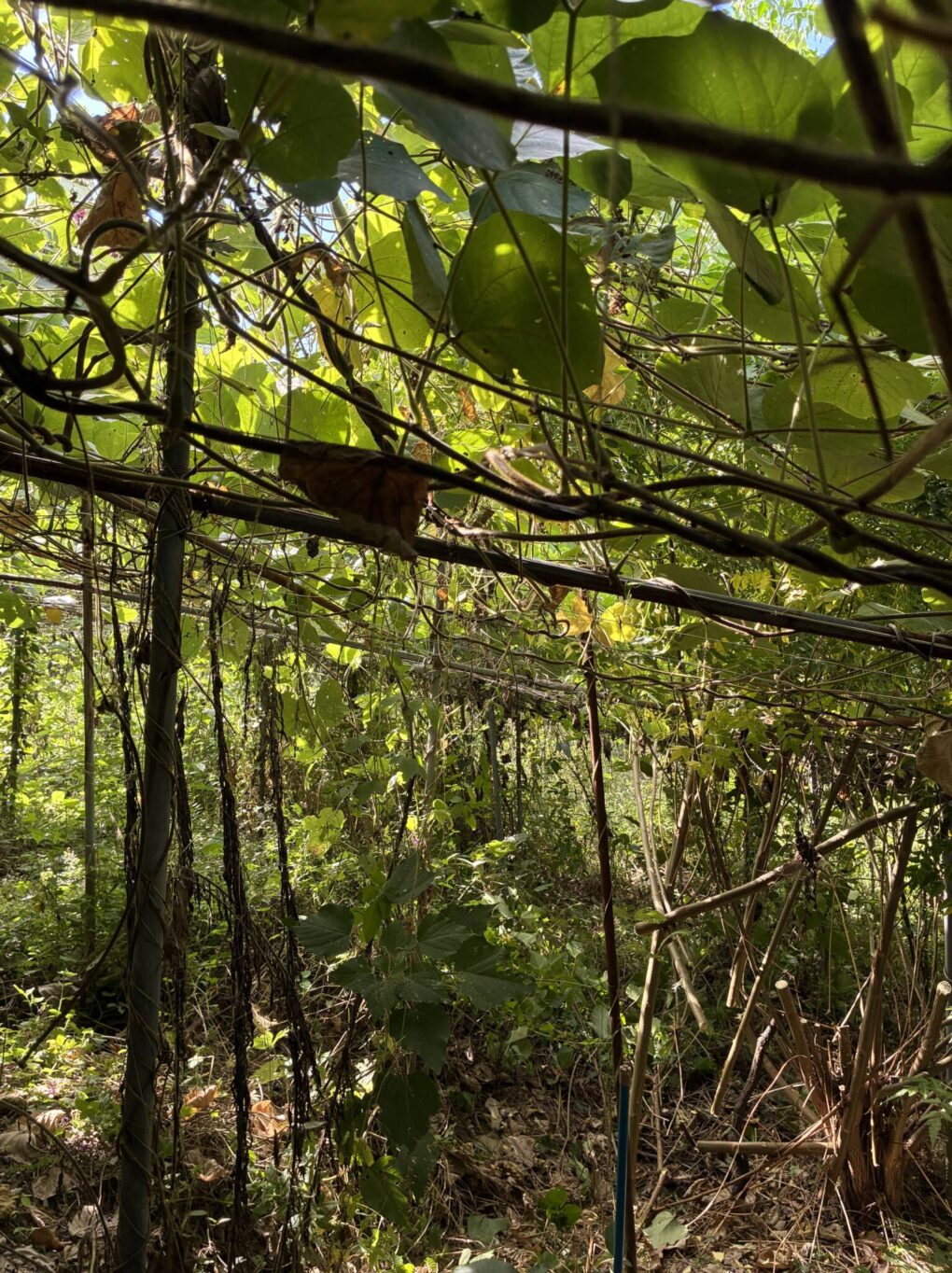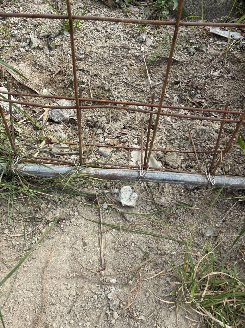 相変わらずイノシシは侵入してくるので、入口付近の金属網の下の部分にパイプを通して固定したりもしています。