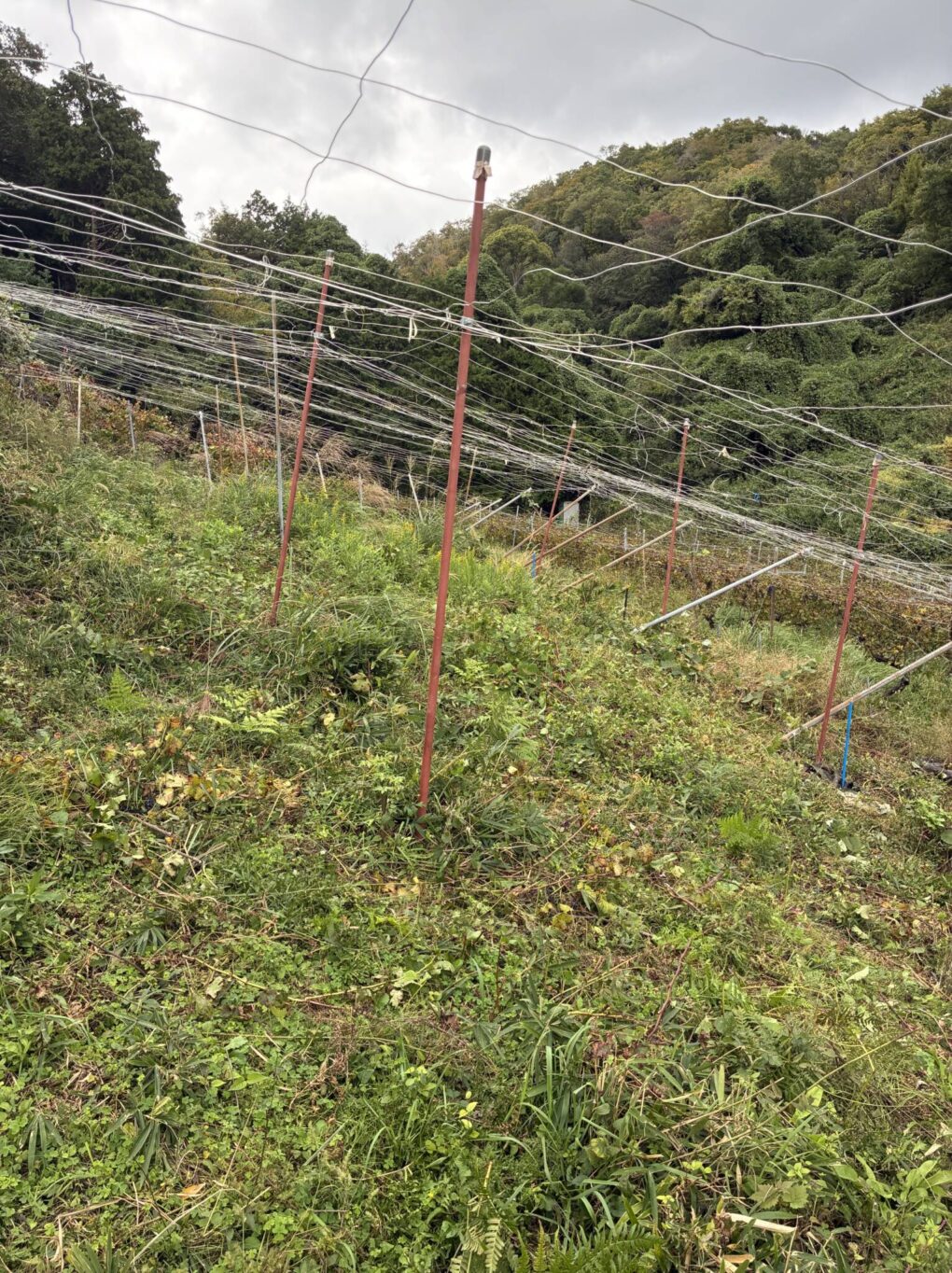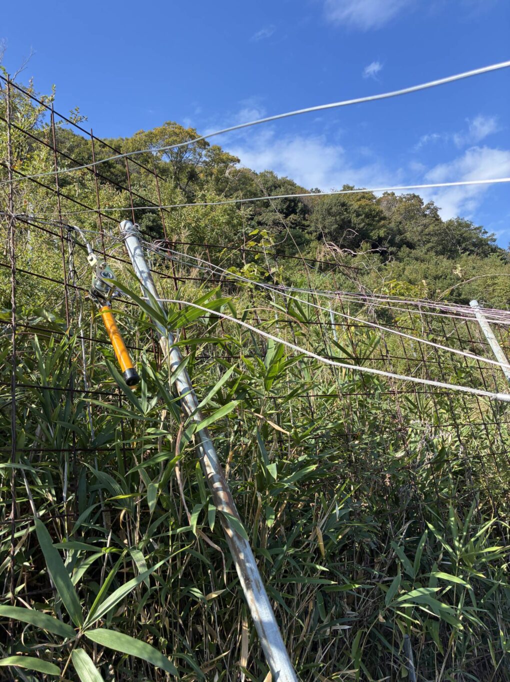 今週は、調子の悪かった木の撤去作業がだいぶ進みました。山の凸凹した斜面では、棚の高さが高すぎる箇所や低すぎる箇所があるので、余っているパイプをアンカーとして活用し、針金で棚の高さを調整しています。ハンマーで打ち続けたため手が少し痺れてし... -
